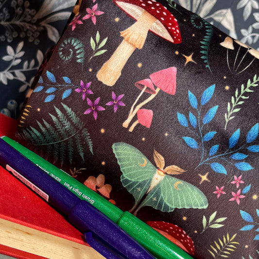Astuccio beauty bag velluto verde e funghi, bosco witchy cottagecore