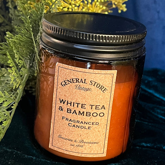 Candela profumata "General Store" in vetro ambrato stile vintage, 2 varianti