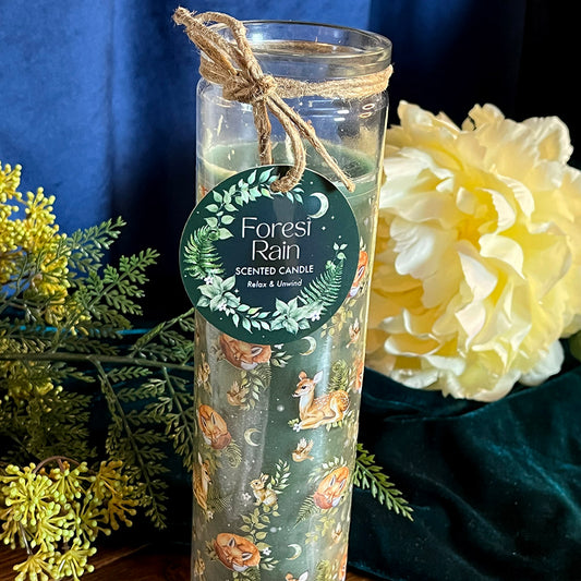Candela profumata "Forest Rain" con disegni di animali del bosco