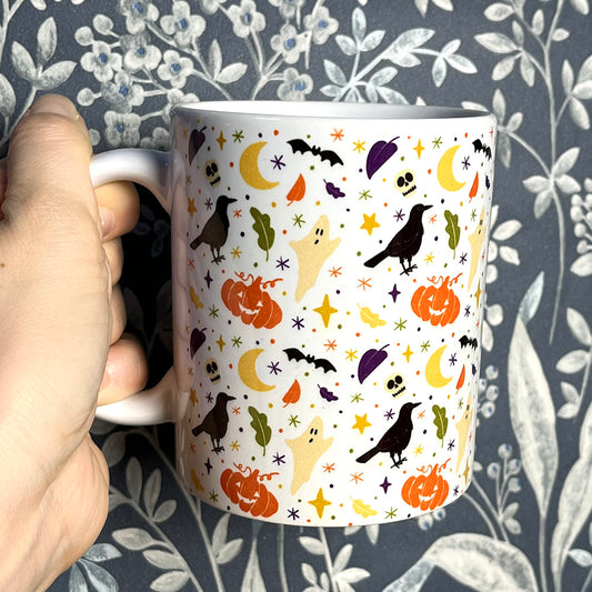 "Halloween Things" mug, autumn pattern, pumpkin, crow, ghost