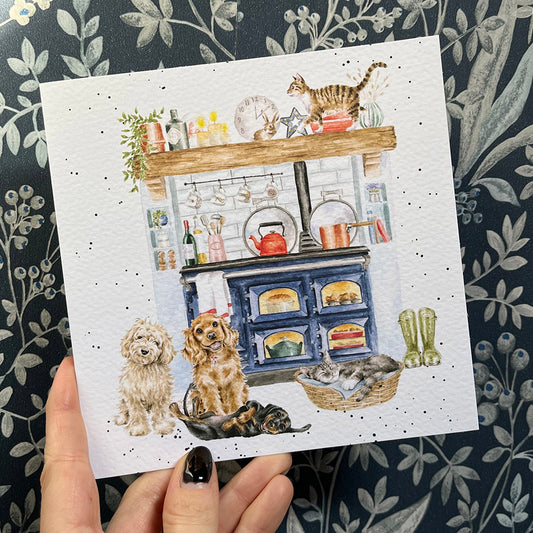 Watercolor illustrated greeting card "Country Kitchen" with cats and dogs, cottagecore shabby chic aesthetic