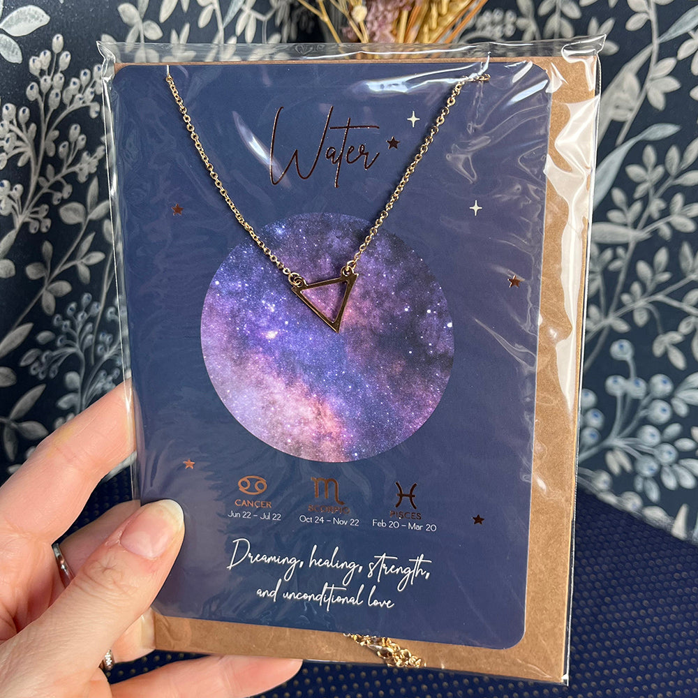 The perfect combination of greeting card and gift. The colored cardboard card with rounded corners displays a nickel-free metal chain with a pendant depicting the symbols of the water, air, earth, and fire signs. The front features the signs corresponding to each element, and underneath are some words describing those born under these zodiac signs.
