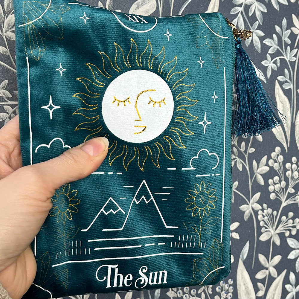 Deliziosa pochette in velluto con chiusura zip, raffigurante una carta dei tarocchi, con ciondolo e nappina di colore abbinato. Stampa in bianco con dettagli dorati. Un astuccio bello e versatile in cui poter conservare cancelleria, make up, il proprio mazzo di tarocchi o oracoli preferiti! Misura 19,5x15cm ed è perfetto anche per portare con sè il proprio ebook reader, protetto con stile!