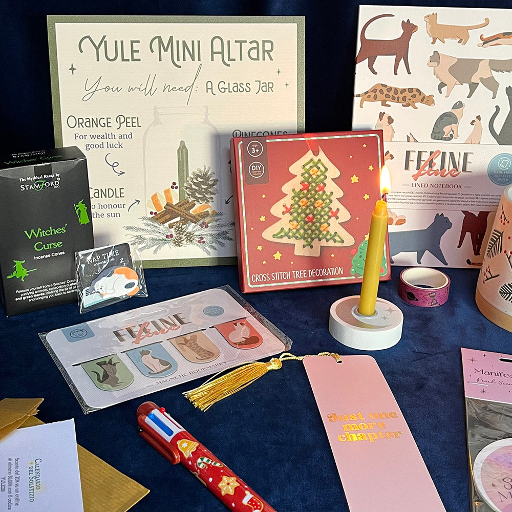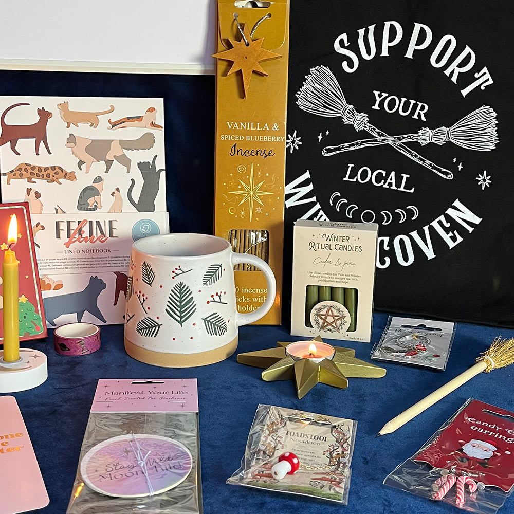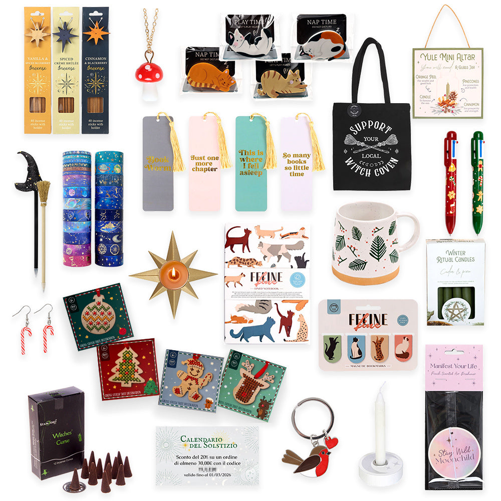 Gli articoli variano da oggetti di cartoleria a elementi di home decor e accessori, mescolando stile witchy e natalizio classico.