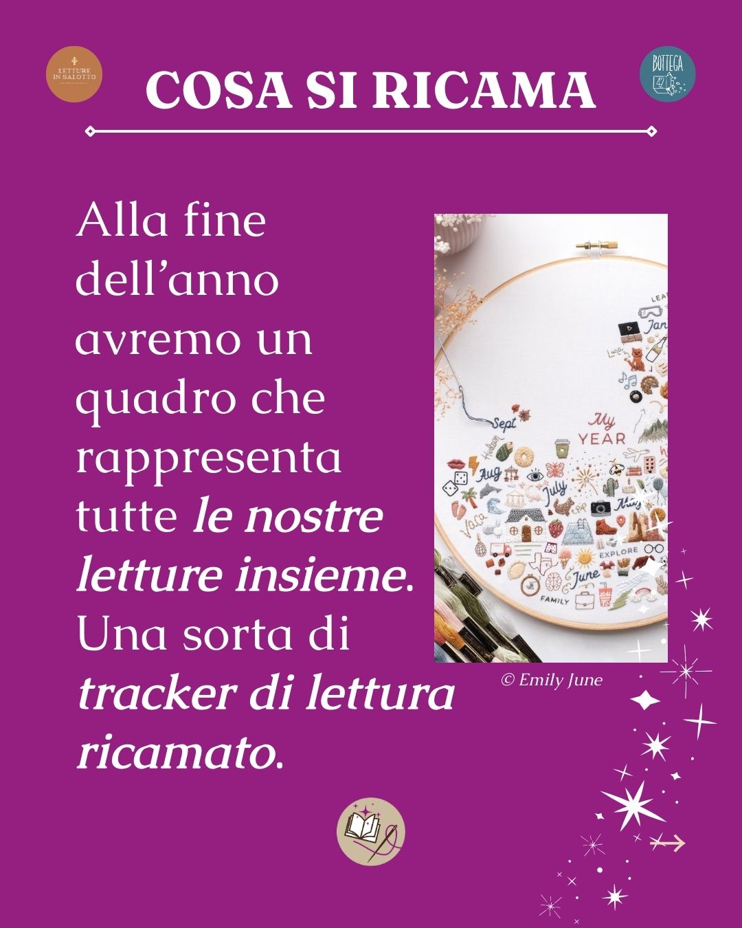 Scegliamo un simbolo, un elemento semplice e uguale per tuttə, rappresentativo del libro del mese. Lo ricamiamo su un telaio tondo, acquistabile al primo incontro.